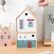 A wooden house-shaped storage box that doubles as a tissue box, perfect for kids' room decor.